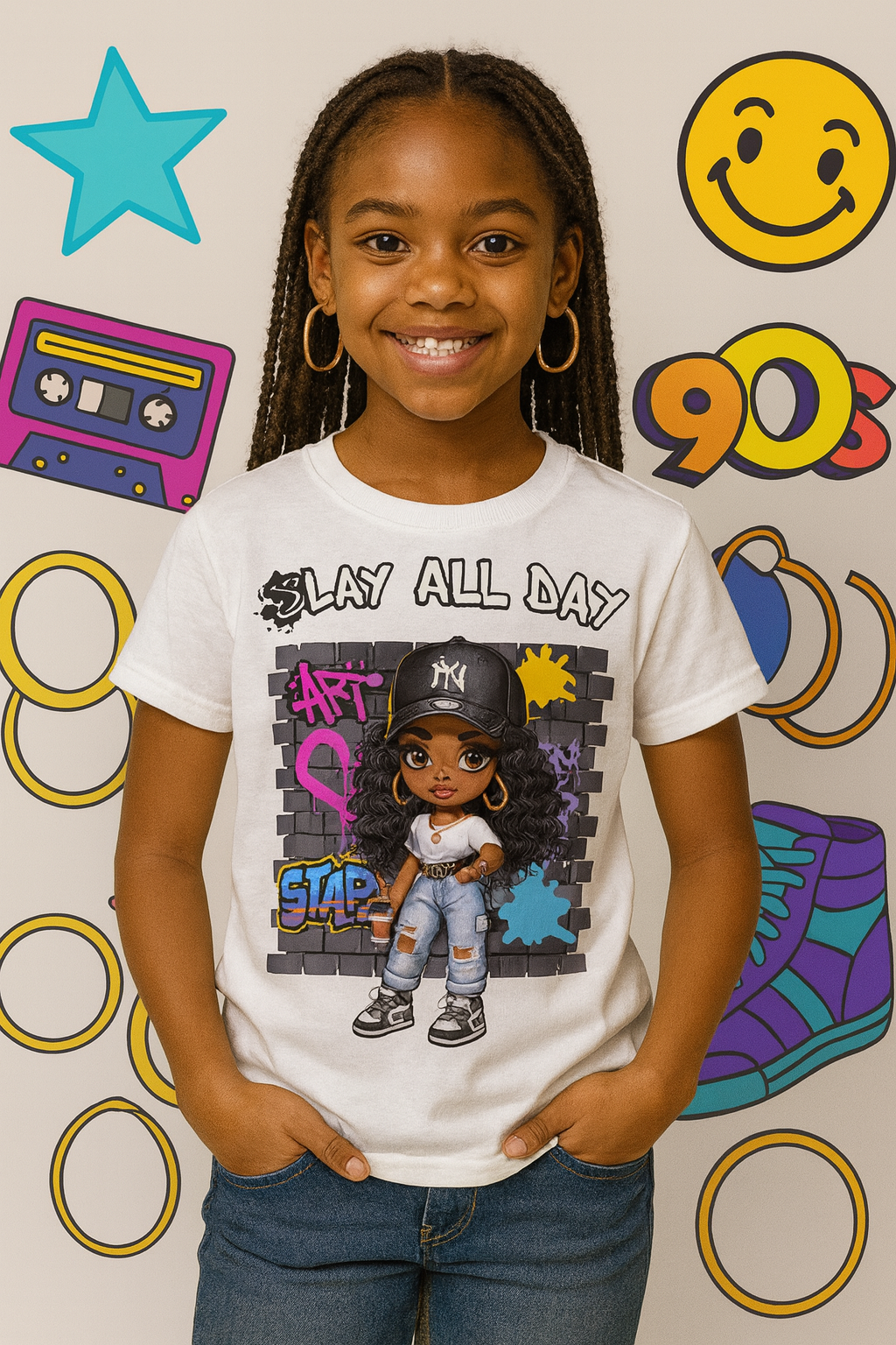 Bring back the bold, fun energy of the 90’s with our Slay All Day graphic tee for girls, where confidence meets creativity. This short sleeve roundneck top for girls showcases a vibrant streetwear-inspired character set against a colorful graffiti backdrop, celebrating style, self-expression, and unstoppable vibes. Perfect for moms and daughters who love matching outfits, this tee combines nostalgic 90’s flair with modern empowerment, making it a must-have for trendy girls and tween fashion.